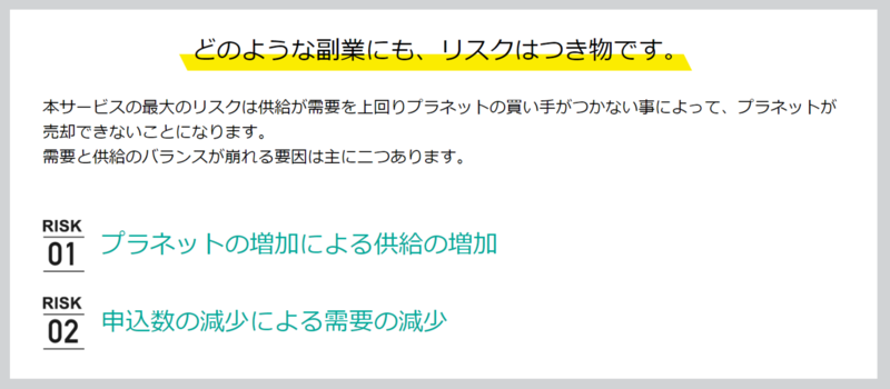 先ほどお伝えした通り、このサービスは供給が需要を上回ることが最大のリスクです。