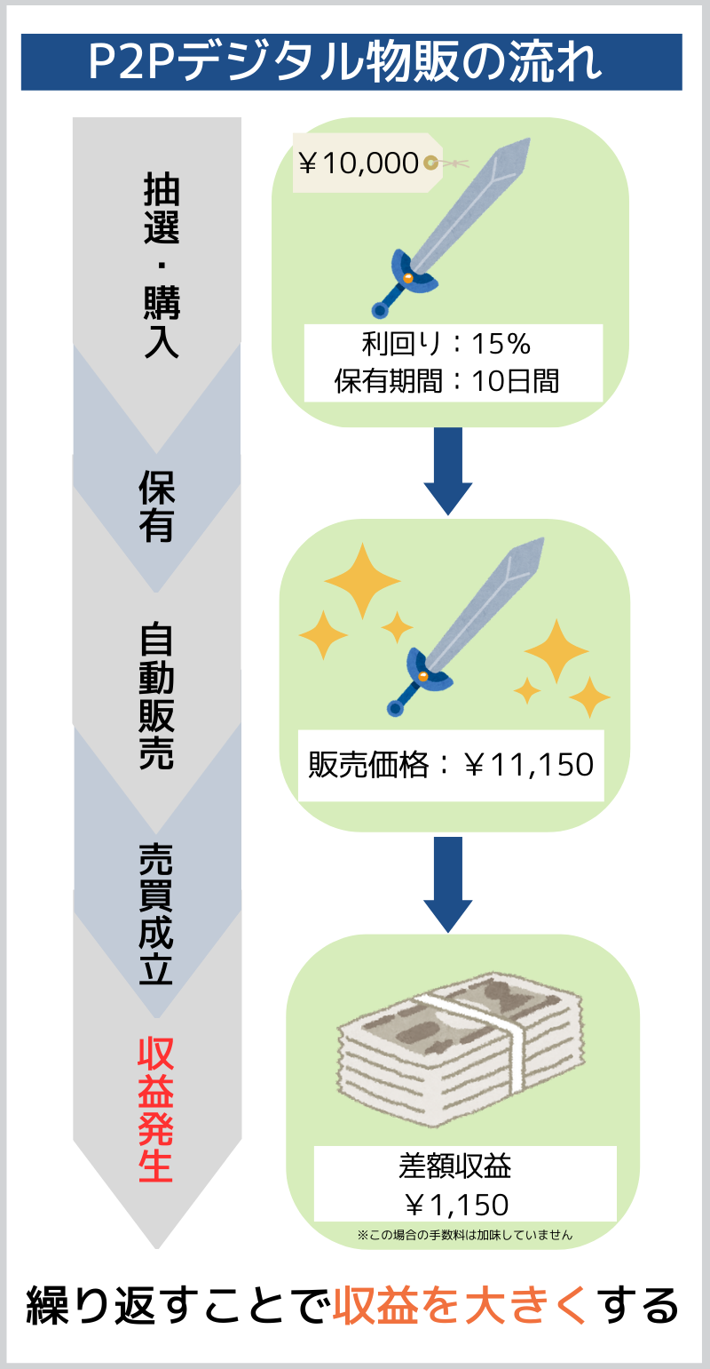 このようにアイテムの転売を繰り返して、利益を大きくしていくのがP2Pデジタル物販です。