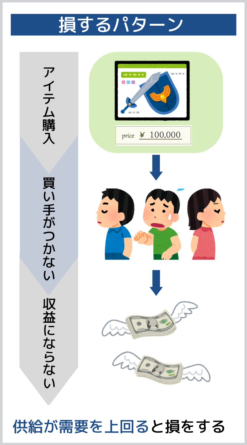 すると、次第に買い手がつかなくなり、最後にそのアイテムを所有していた人が損をしてしまうのです。